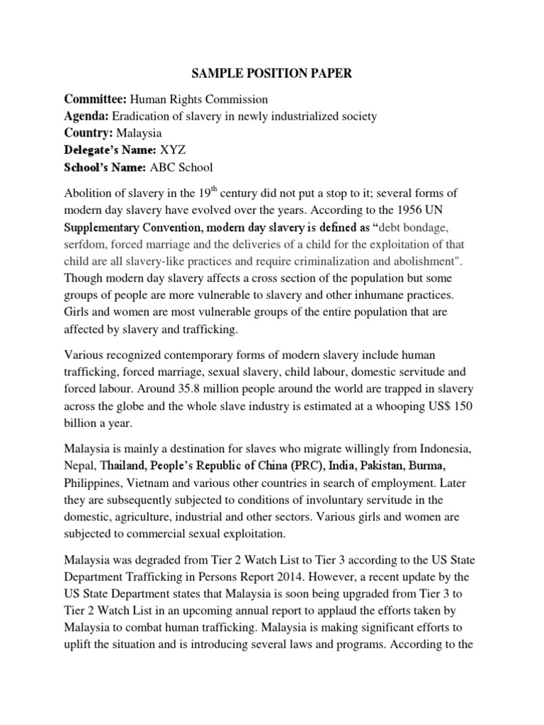 Most model un conferences require delegates to submit a position paper, an essay covering a country's perspective on the assigned topics of a conference. · length may not exceed two pages. Policy regarding the situation in. A position paper is a diplomatic statement of your country's position on the issues before your below is (1) an annotated position paper sample to help guide you in formatting (2) a sample. What is a position paper?